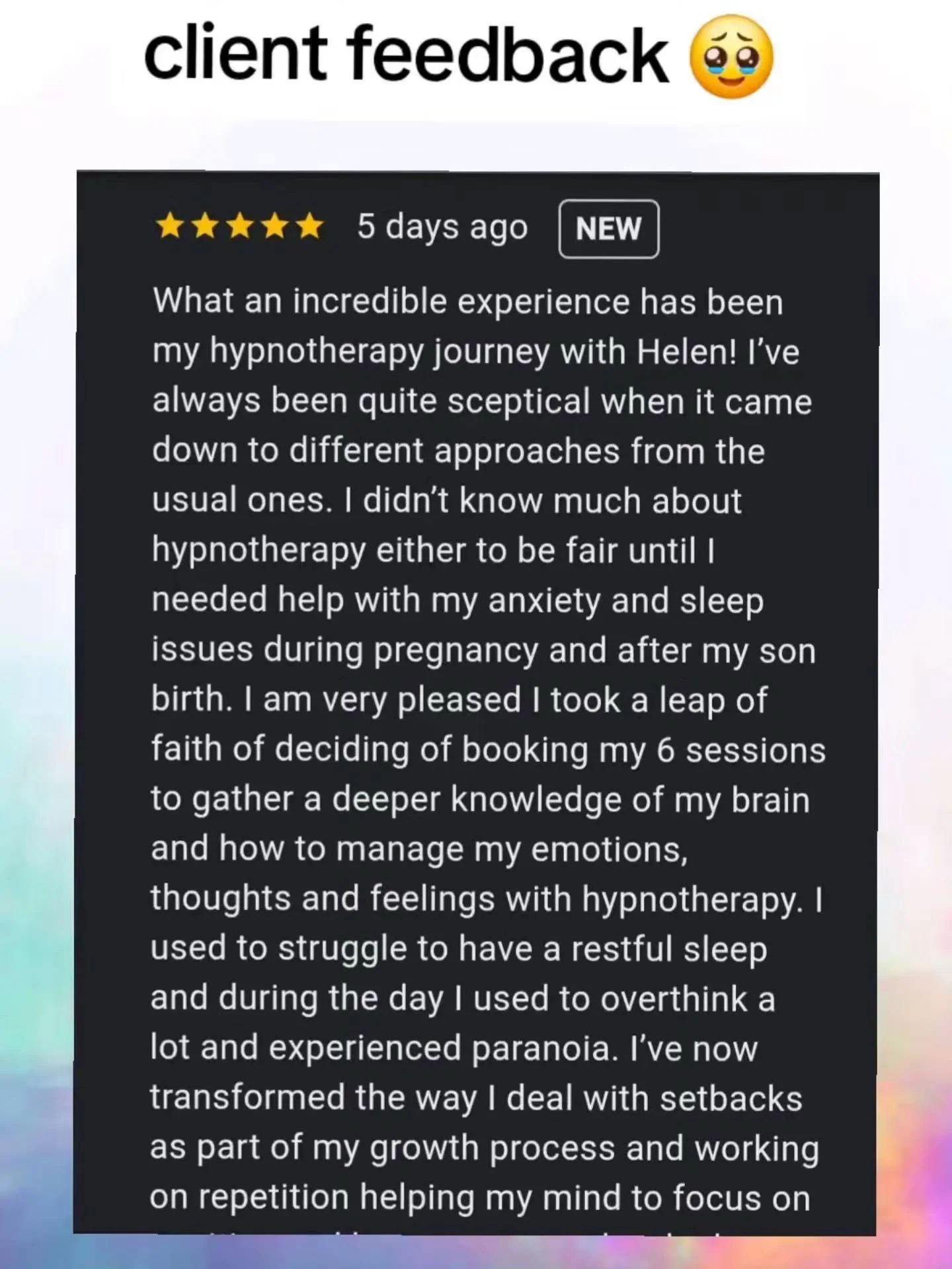 As long as you are comfortable and in a safe space with a good connection, hypnotherapy online can be just as effective as face to face.